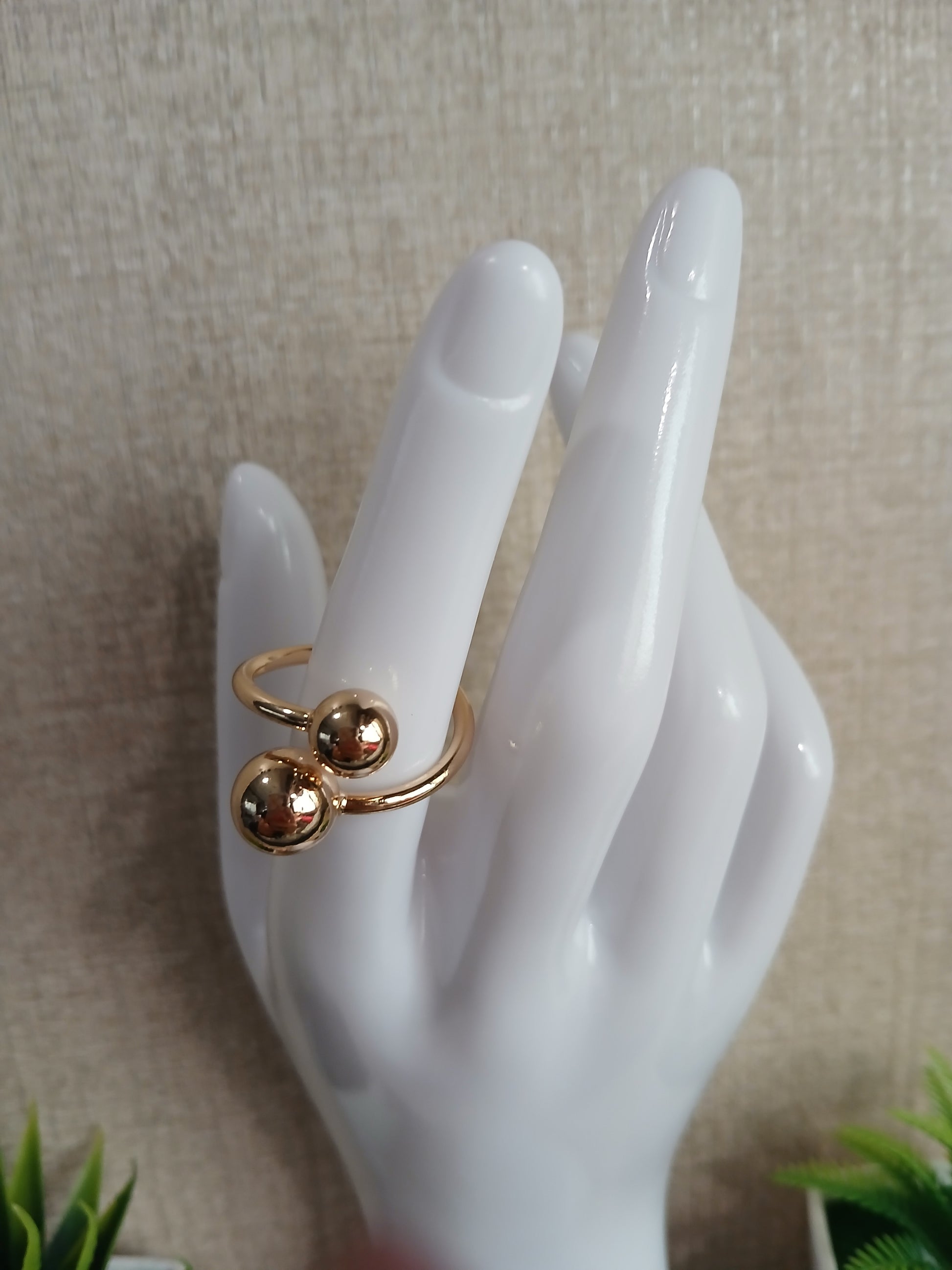 💍 Dúo Dorado – Anillo abierto con esferas en oro laminado Menos es más. Este anillo en oro laminado 14k presenta un diseño abierto con dos esferas doradas en cada extremo, una más grande que la otra, creando un equilibrio visual perfecto.