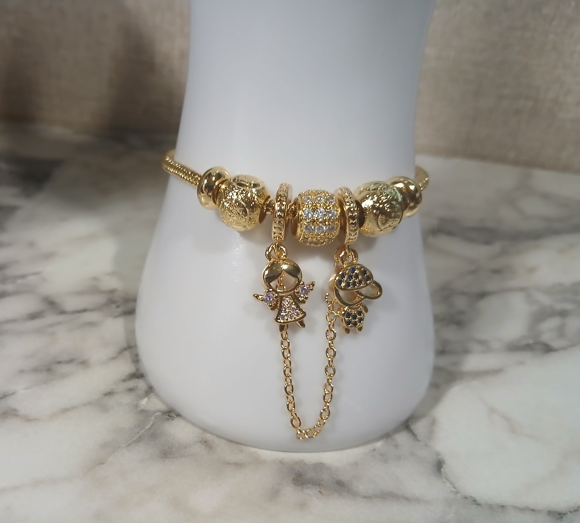 Una pieza verdaderamente encantadora, esta pulsera estilo Pandora incluye una hermosa cadena de seguridad con dijes de niña y niño, decorados con piedras de zirconia en tonos rosa y azul que le dan un toque tierno y divertido.
